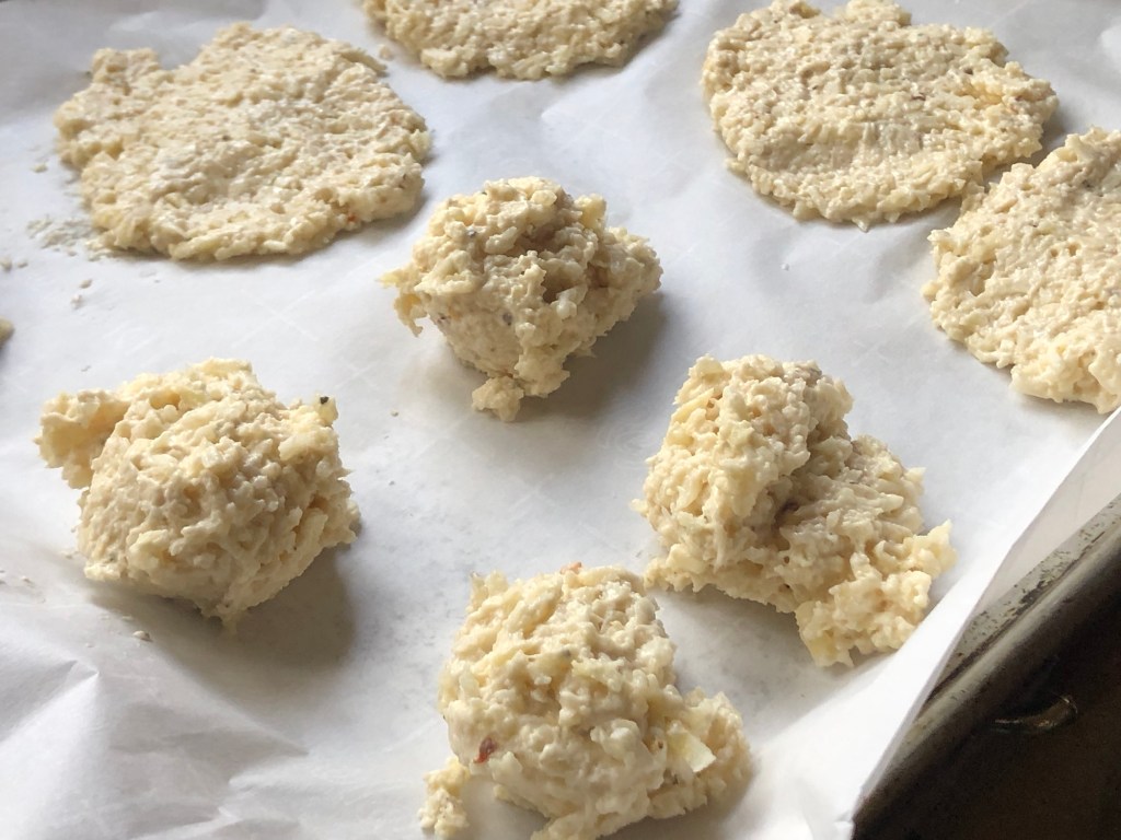 Scoop out each layer by placing them on a cookie sheet with parchment paper. Line each roll and then place product flat with a spoon making the perfect biscuit size.