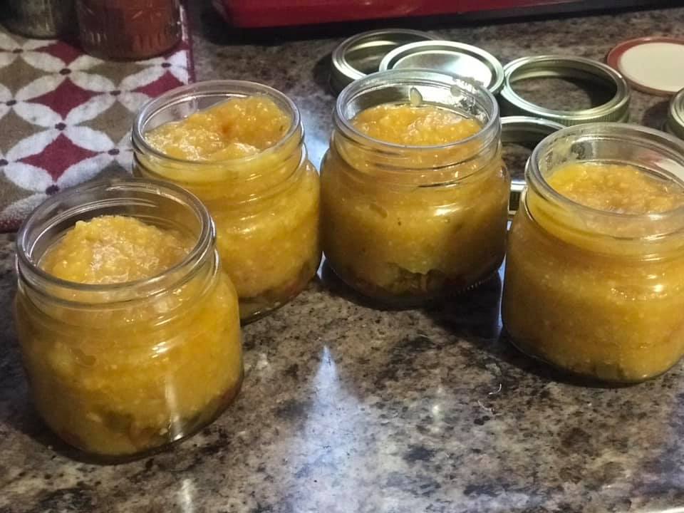 Peach Butter: crockpot cooked with honey, cinnamon, and nutmeg. This was cooked down to a butter flavor much like apple and pear butter.
