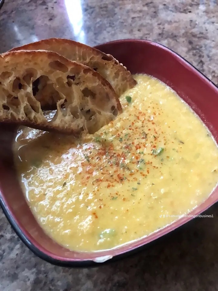 This recipe was with yellow and orange carrots. The soup was topped with vegetable broth, scallions, white onion, green onion, and onion chives. Seasoned nicely with salt, pepper, minced garlic, parsley, and paprika.